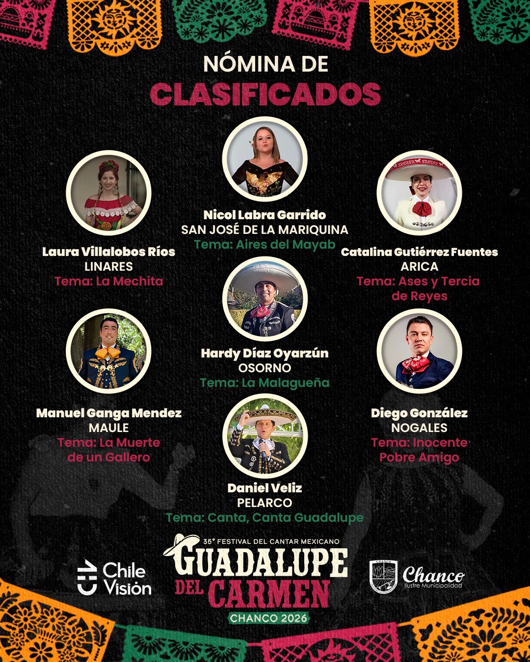 Por su parte, el encargado del Departamento de Cultura del municipio, Angelo Yévenes, subrayó el nivel artístico del proceso de selección. “Hemos visto interpretaciones de altísimo nivel, con un respeto profundo por el folclore mexicano. Eso habla del prestigio que ha alcanzado el Festival Guadalupe del Carmen y del interés que genera en intérpretes de todo Chile”, afirmó.